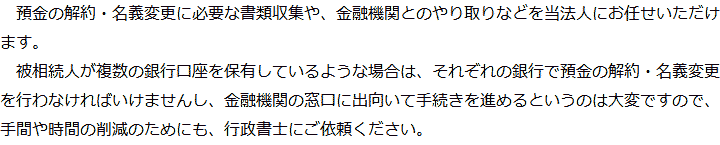 トップ業務内容預金・貯金の解約・名義変更 階層構造▼ 業務内容(目次) 預金・貯金の解約・名義変更 業務内容(目次)業務内容トップ行政書士法人心の業務内容遺言遺産整理相続人調査相続財産調査遺産分割協議書の作成預金・貯金の解約・名義変更証券口座の解約・名義変更自動車の名義変更心グループのその他の業務内容家族信託・民事信託節税対策事業承継遺言の検認相続放棄限定承認遺産分割遺留分侵害額請求相続登記相続税申告相続税調査 受付時間 平日 9時~21時、土日祝 9時~18時 夜間・土日祝の相談も対応します (要予約) 所在地 〒477-0031 愛知県東海市大田町下浜田1016番地ユウナル東海105 0120-2403-39 お問合せ・アクセス・地図