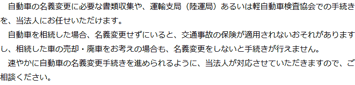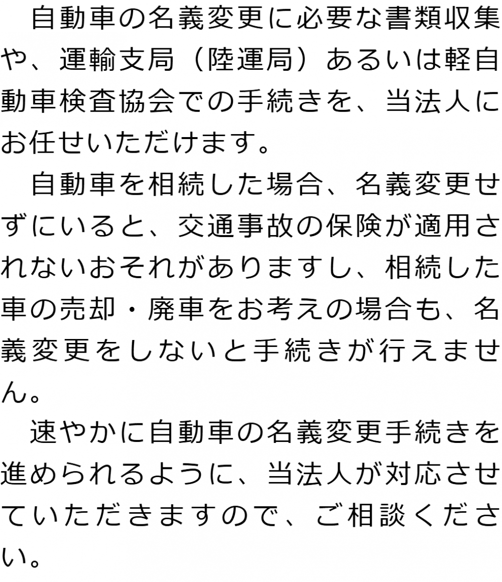 トップ業務内容自動車の名義変更 階層構造▼ 業務内容(目次) 自動車の名義変更 業務内容(目次)業務内容トップ行政書士法人心の業務内容遺言遺産整理相続人調査相続財産調査遺産分割協議書の作成預金・貯金の解約・名義変更証券口座の解約・名義変更自動車の名義変更心グループのその他の業務内容家族信託・民事信託節税対策事業承継遺言の検認相続放棄限定承認遺産分割遺留分侵害額請求相続登記相続税申告相続税調査 受付時間 平日 9時~21時、土日祝 9時~18時 夜間・土日祝の相談も対応します (要予約) 所在地 〒477-0031 愛知県東海市大田町下浜田1016番地ユウナル東海105 0120-2403-39 お問合せ・アクセス・地図