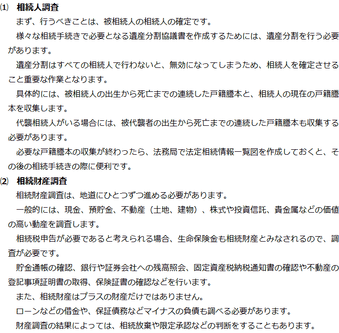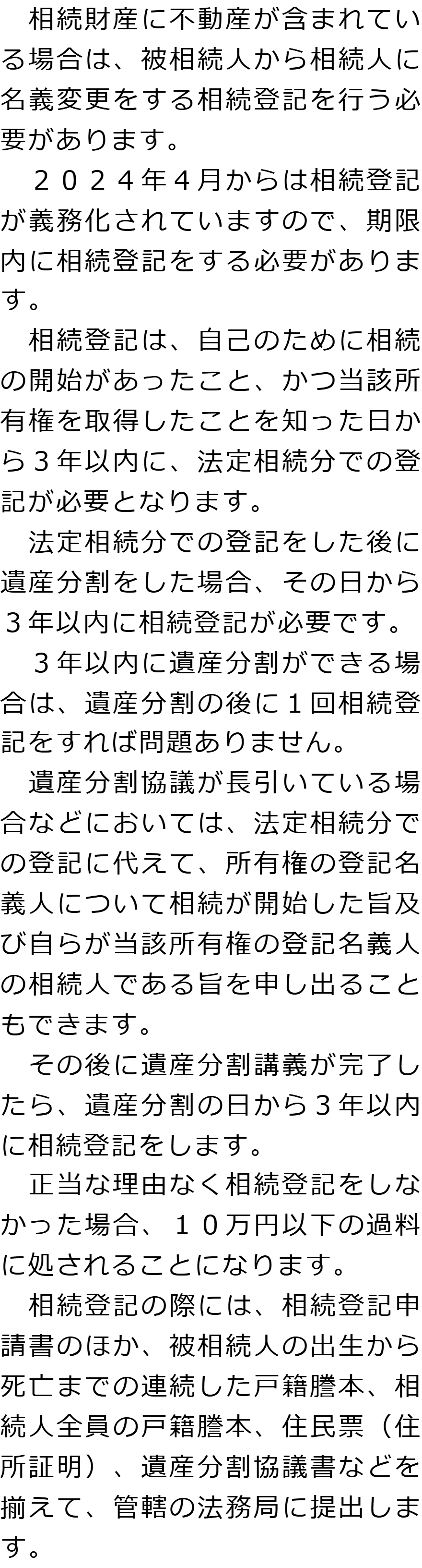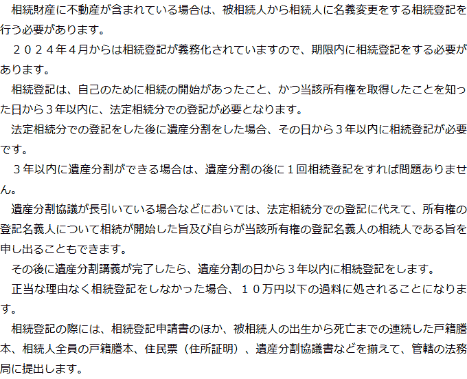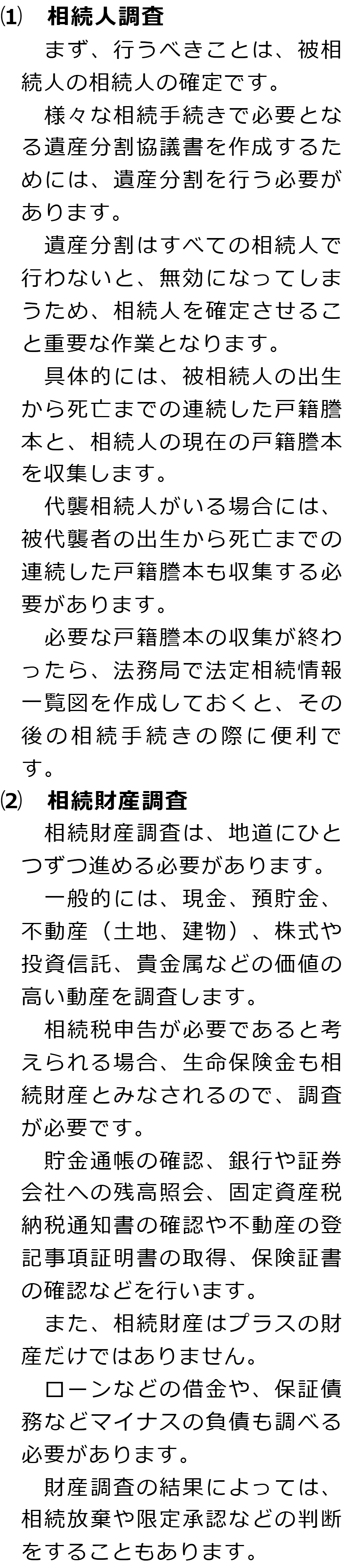 相続手続きの必要事項に関するQ&AQ相続手続きでは何をする必要がありますか?Q相続人調査と相続財産調査では何をする必要がありますか?Q遺産分割では何が必要ですか?Q相続登記はどのような場合に必要ですか?Q相続税申告はどのような場合に必要ですか? Q相続手続きでは何をする必要がありますか?AQ相続人調査と相続財産調査では何をする必要がありますか?AQ遺産分割では何が必要ですか?AQ相続登記はどのような場合に必要ですか?AQ相続税申告はどのような場合に必要ですか?A Q&A(目次)Q&Aトップ相続手続きの必要事項に関するQ&A 受付時間 平日 9時~21時、土日祝 9時~18時 夜間・土日祝の相談も対応します (要予約) 所在地 〒477-0031 愛知県東海市大田町下浜田1016番地ユウナル東海105 0120-2403-39 お問合せ・アクセス・地図